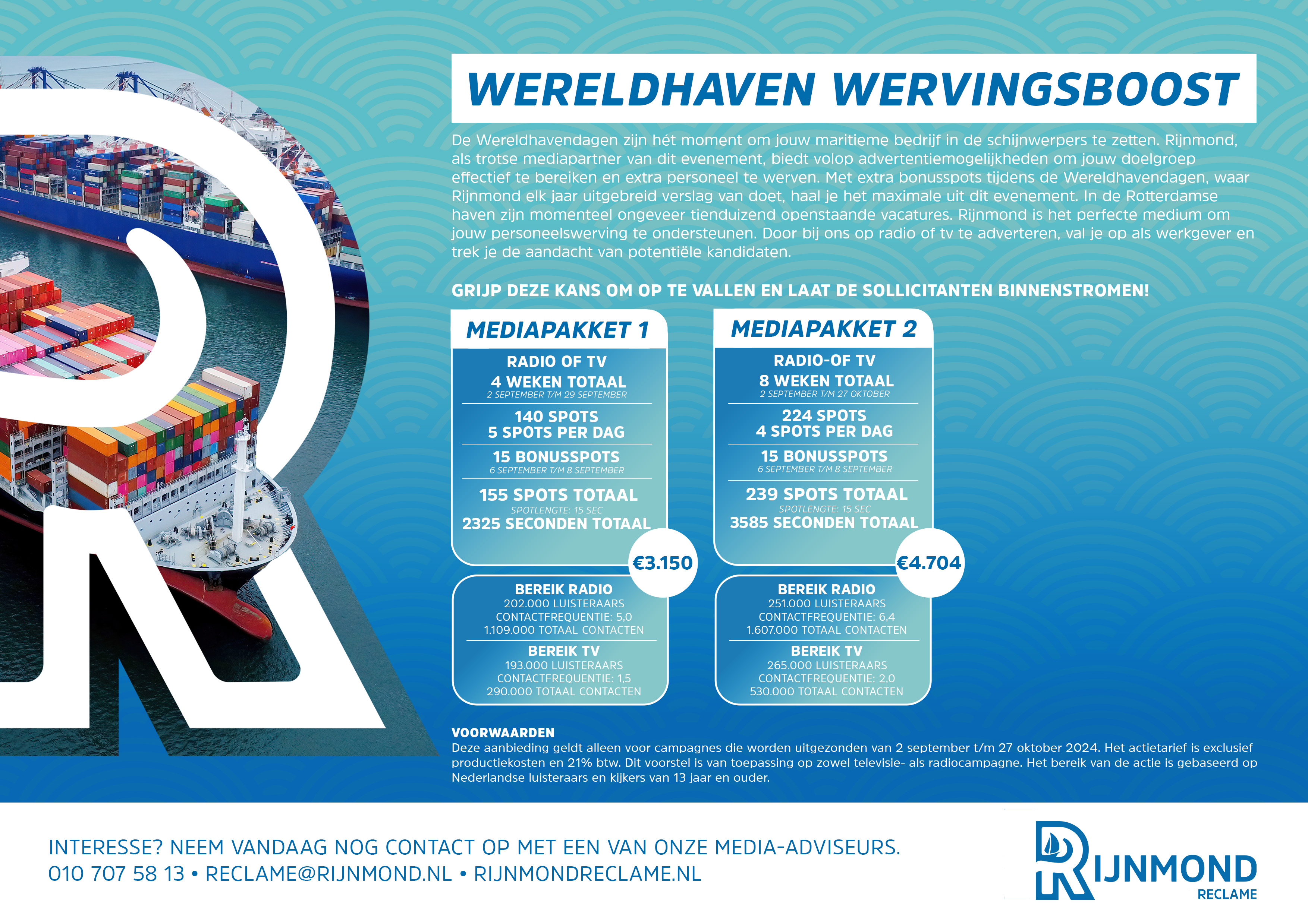 De Wereldhavendagen zijn hét moment om jouw maritieme bedrijf in de schijnwerpers te zetten. Rijnmond, als trotse mediapartner van dit evenement, biedt volop advertentiemogelijkheden om jouw doelgroep effectief te bereiken en extra personeel te werven. Met extra bonusspots tijdens de Wereldhavendagen, waar Rijnmond elk jaar uitgebreid verslag van doet, haal je het maximale uit dit evenement. In de Rotterdamse haven zijn momenteel ongeveer tienduizend openstaande vacatures.